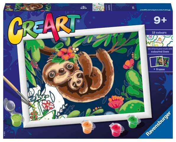 CreArt - to je kreativní zábava doslova pro každého. Staňte se na chvíli profesionálním malířem a namalujte si svůj vlastní obraz. Tito roztomilí lenochodi rozzáří každou zeď. Postupně vybarvujte jednotlivé plochy podle návodu (každé číslo na plátně odpovídá jedné konkrétní barvě) a dopřejte si radost z tvůrčí práce, u které se zabavíte na dlouhé hodiny. Malování je skvělá činnost, která nejen baví, ale také procvičuje zručnost, zlepšuje koncentraci a zaručuje spokojenost a pocit hrdosti všem umělcům. Set obsahuje vše, co potřebujete k malování: vysoce kvalitní, pevné plátno s obrazovou předlohou s očíslovanými plochami, sadu akrylových barev, štětec, kartonový stojánek pro kelímky s barvami a rámeček. Vykreslené plochy vytváří profesionálně vypadající umělecké dílo. Jakmile obraz dokončíte, nechte ho zaschnout a zarámujte ho do rámečku, který je součástí balení. Malování nikdy nebylo tak jednoduché.
