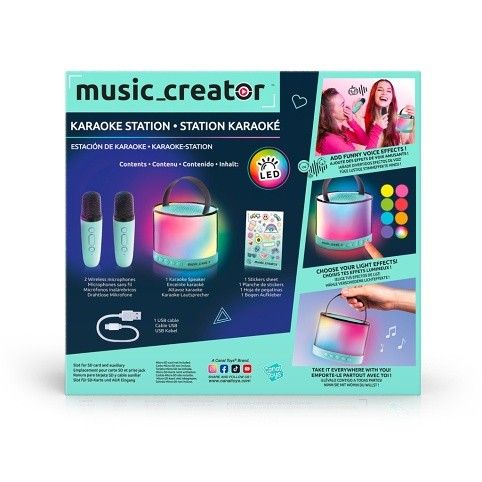Creator Karaoke set – To jsou hodiny zábavy a kreativity s touto mini bezdrátovou karaoke stanicí. Ideální pro přehrávání hudby a zpěv, sólo nebo duet, a to díky dvěma bezdrátovým mikrofonům, které jsou součástí balení. Velmi snadné použití, stačí připojit ke zdroji hudby (Bluetooth, SD karta atd.) a můžete přehrávat hudbu a zpívat své oblíbené písně. Tuto karaoke stanici si můžete vzít kamkoli a tak zažít spontánní chvíle zpěvu s rodinou nebo přáteli. Vestavěné 4 hlasové efekty a LED světla vytvářejí skvělou párty atmosféru. Dobíjecí baterie reproduktoru a mikrofonů zajistí hodiny zpěvu bez přerušení, takže zábava nikdy nekončí. Ideální dárek pro malé i větší děti, které milují hudbu a zpěv. Balení obsahuje 1 x bezdrátový reproduktor, 2 x bezdrátové mikrofony, 1 x kabel USB-C a 1 x uživatelskou příručku. Na baterie: 1x Li-ion (je součástí balení)