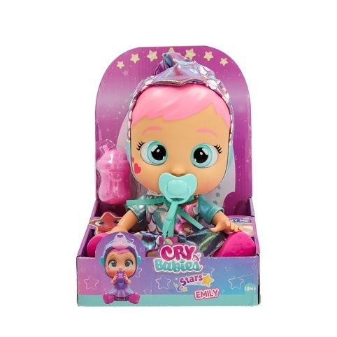 Cry Babies se nyní vydávají ke hvězdám v sérii Cry Babies Stars. Jako všechny vaše oblíbené postavy Cry Babies, když ji vyjmete z úst dudlík budou ronit slzy. Jejich oči jsou plné hviezd stejně jako noční obloha. Vydává až 10 realistických dětských zvuků. Dejte jim dudlík zpět do pusy, aby přestali plakat a byli zase šťastné. S panenkami Cry Babies si děti budou hrát jako s opravdovými miminky. Můžou je chovat, uvidí je brečet, můžou je převlékat a starat se o ně. Vyžadauje 3xAA baterie. Doporučený věk 3+.