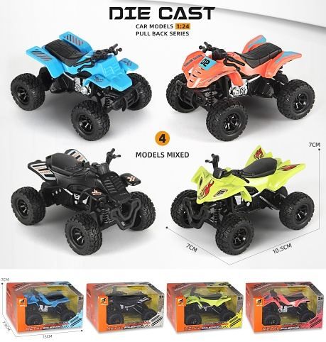Čtyřkolka kovová. Rozměry 10,5x7x7 cm. Na zpětné natažení. 4 varianty - modrá, oranžová, černá, zelená.