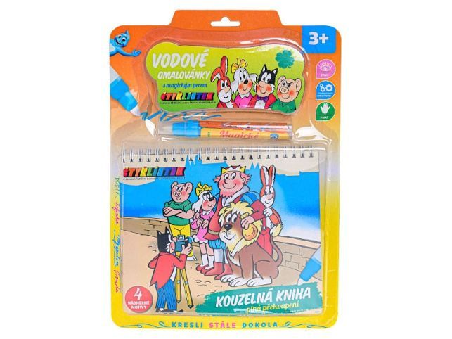 Vodové omalovánky jsou v designu Čtyřlísteku - známého dětského televizního seriálu. Není jednoduššího malování bez čmáranců na stole. Stačí naplnit fix vodou a nechat dítě, ať si maluje po kartě. Postupným malováním vzníká barevný obrázek. Po cca 10 minutách malování zmizí a můžete začít znovu. Vhodné pro děti od 3 let.