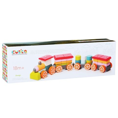 CUBIKA je nová značka dřevěných hraček vyrobených pouze z ekologicky pěstovaného dřeva s velmi precizním opracováním a líbivým designem. Vláček se třemi vagonky je dřevěná skládačka s 35 barevnými díly. Jednotlivé kostičky je třeba poskládat tak, aby mohl vláček vyrazit s plným nákladem na cestu. Sortiment hraček značky CUBIKA pomáhá dětem rozvíjet především senzomotorické schopnosti a dovednosti, logické myšlení, kreativitu, představivost a různé poznávací znalosti. Hračky jsou vyrobeny z nejkvalitněšího javoru a buku a k barvení se používají též vysoce kvalitní barvy na vodní bázi, které jsou naprosto bezpečné pro děti a nemají žádný zápach. Všechny výrobky této značky mají německý certifikát TÜV a jsou vyrobeny dle evropské normy pro bezpečnost hraček EN 71. Nevhodné pro děti do 18 měsíců. Vyrobeno v Evropě.