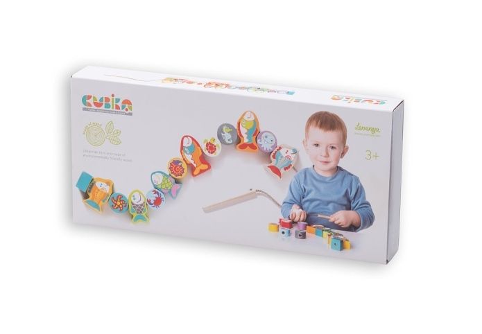 CUBIKA je nová značka dřevěných hraček vyrobených pouze z ekologicky pěstovaného dřeva s velmi precizním opracováním a líbivým designem. Navlékací ryby a mořští živočichové jsou ideální hrou pro procvičení jemné motoriky, trpělivosti a paměti. Sada nabízí 12 dřevěných navlékacích prvků s mořskou tematikou, jednu tkaničku s dřevěným kolíčkem na prostrkování na jedné straně a zarážkou na druhé straně a 8 předloh s různě seřazenými tematickými prvky, podle kterých děti jednotlivé dílky navlékají. Zdatnější hráči si pak mohou předlohu jen prohlédnout a zkusit navlékat zpaměti. Sortiment hraček značky CUBIKA pomáhá dětem rozvíjet především senzomotorické schopnosti a dovednosti, logické myšlení, kreativitu, představivost a různé poznávací znalosti. Hračky jsou vyrobeny z nejkvalitnějšího javoru a buku a k barvení se používají též vysoce kvalitní barvy na vodní bázi, které jsou naprosto bezpečné pro děti a nemají žádný zápach. Všechny výrobky této značky mají německý certifikát TÜV a jsou vyrobeny dle evropské normy pro bezpečnost hraček EN 71. Nevhodné pro děti do 3 let. Vyrobeno v Evropě.