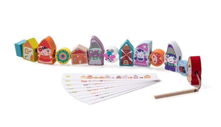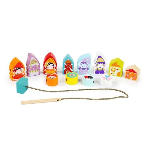 CUBIKA 13654 Navlékací trpaslíci - navlékací set - 13 dřevěných dílů a 8 předloh