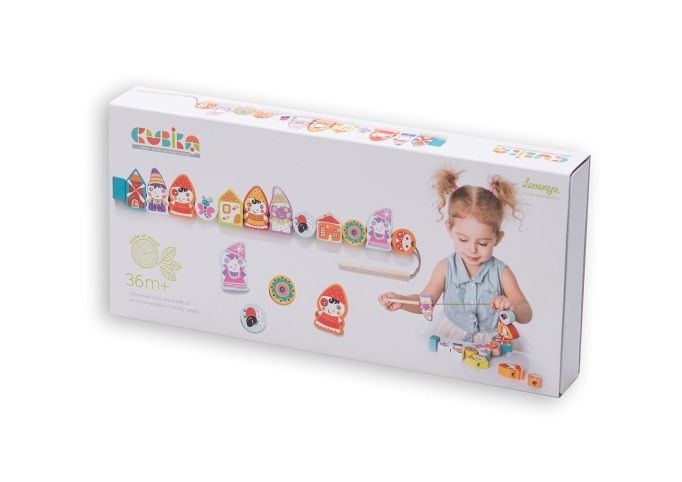 CUBIKA je nová značka dřevěných hraček vyrobených pouze z ekologicky pěstovaného dřeva s velmi precizním opracováním a líbivým designem. Navlékací dřevění trpaslíci jsou ideální hrou pro procvičení jemné motoriky, trpělivosti a paměti. Sada nabízí 12 dřevěných navlékacích prvků s trpaslíky, jejich domečky s různými doplňky, jednu tkaničku s dřevěným kolíčkem na prostrkování na jedné straně a zarážkou na druhé straně a 8 předloh s různě seřazenými tematickými prvky, podle kterých děti jednotlivé dílky navlékají. Zdatnější hráči si pak mohou předlohu jen prohlédnout a zkusit navlékat zpaměti. Sortiment hraček značky CUBIKA pomáhá dětem rozvíjet především senzomotorické schopnosti a dovednosti, logické myšlení, kreativitu, představivost a různé poznávací znalosti. Hračky jsou vyrobeny z nejkvalitnějšího javoru a buku a k barvení se používají též vysoce kvalitní barvy na vodní bázi, které jsou naprosto bezpečné pro děti a nemají žádný zápach. Všechny výrobky této značky mají německý certifikát TÜV a jsou vyrobeny dle evropské normy pro bezpečnost hraček EN 71. Nevhodné pro děti do 3 let. Vyrobeno v Evropě.