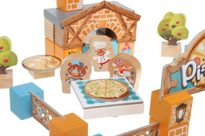 CUBIKA je nová značka dřevěných hraček vyrobených pouze z ekologicky pěstovaného dřeva s velmi precizním opracováním a líbivým designem. Dřevěná stavebnice "Pizzeria" obsahuje 30 dřevěných dílků a 12 kartonových tematických doplňků, které jsou vyrobeny z velice pevného vícevrstvého kartonu s lesklým povrchem. Děti se během hry přenesou do venkovní pizzerie, kde mohou ochutnat 3 druhy pizzy. Sortiment hraček značky CUBIKA pomáhá dětem rozvíjet především senzomotorické schopnosti a dovednosti, logické myšlení, kreativitu, představivost a různé poznávací znalosti. Hračky jsou vyrobeny z nejkvalitnějšího javoru a buku a k barvení se používají též vysoce kvalitní barvy na vodní bázi, které jsou naprosto bezpečné pro děti a nemají žádný zápach. Všechny výrobky této značky mají německý certifikát TÜV a jsou vyrobeny dle evropské normy pro bezpečnost hraček EN 71. Nevhodné pro děti do 36 měsíců. Vyrobeno v Evropě.