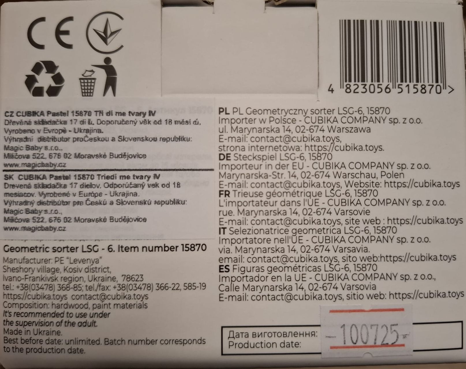 CUBIKA je značka dřevěných hraček vyrobených pouze z ekologicky pěstovaného dřeva s velmi precizním opracováním a líbivým designem a tento výrobek patří do nové kolekce vyrobené v pastelových barvách. Třídíme tvary IV je dřevěná skládačka s 16 barevnými perforovanými geometrickými tvary, které se umísťují na čtvercovou základnu. Jednotlivé tvary mají i své opakující se barvy, které se děti touto hrou také učí rozlišovat. Sortiment hraček značky CUBIKA pomáhá dětem rozvíjet především senzomotorické schopnosti a dovednosti, logické myšlení, kreativitu, představivost a různé poznávací znalosti. Hračky jsou vyrobeny z nejkvalitnějšího javoru a buku a k barvení se používají též vysoce kvalitní barvy na vodní bázi, které jsou naprosto bezpečné pro děti a nemají žádný zápach. Všechny výrobky této značky mají německý certifikát TÜV a jsou vyrobeny dle evropské normy pro bezpečnost hraček EN 71. Doporučený věk od 18 měsíců. Vyrobeno v Evropě.