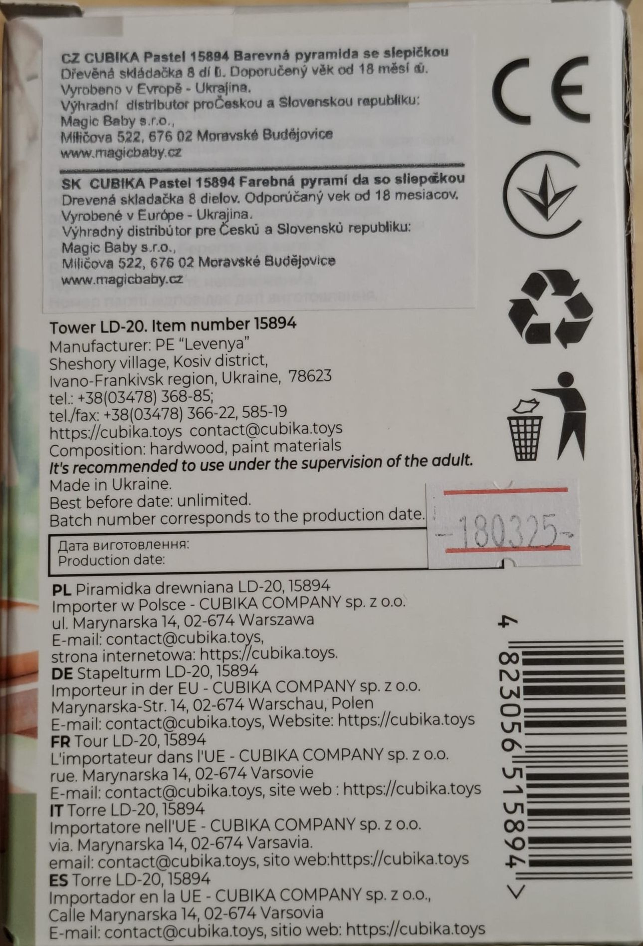 CUBIKA je značka dřevěných hraček vyrobených pouze z ekologicky pěstovaného dřeva s velmi precizním opracováním a líbivým designem a tento výrobek patří do nové kolekce vyrobené v pastelových barvách. Barevná pyramida se slepičkou je dřevěná skládačka s 8 díly, které by na sebe měly být poskládány tak, aby bylo možné zachovat při stavbě správný tvar starodávné egyptské pyramidy a zároveň zachovat plynulou posloupnost barev. Při její stavbě se také děti naučí co je to kompatibilita. Sortiment hraček značky CUBIKA pomáhá dětem rozvíjet především senzomotorické schopnosti a dovednosti, logické myšlení, kreativitu, představivost a různé poznávací znalosti. Hračky jsou vyrobeny z nejkvalitnějšího javoru a buku a k barvení se používají též vysoce kvalitní barvy na vodní bázi, které jsou naprosto bezpečné pro děti a nemají žádný zápach. Všechny výrobky této značky mají německý certifikát TÜV a jsou vyrobeny dle evropské normy pro bezpečnost hraček EN 71. Doporučený věk od 18 měsíců. Vyrobeno v Evropě.