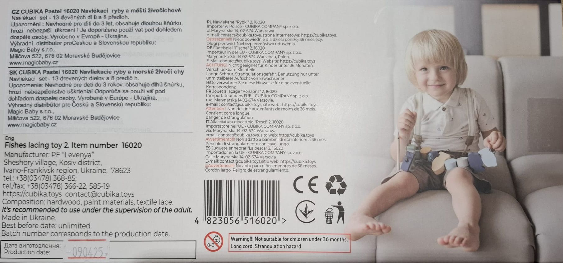 CUBIKA je nová značka dřevěných hraček vyrobených pouze z ekologicky pěstovaného dřeva s velmi precizním opracováním a líbivým designem a tento výrobek patří do nové kolekce vyrobené v pastelových barvách. Navlékací ryby a mořští živočichové jsou ideální hrou pro procvičení jemné motoriky, trpělivosti a paměti. Sada nabízí 12 dřevěných navlékacích prvků s mořskou tematikou, jednu 45 cm dlouhou tkaničku s dřevěným kolíčkem na prostrkování na jedné straně a zarážkou na druhé straně a 8 předloh s různě seřazenými tematickými prvky, podle kterých děti jednotlivé dílky navlékají. Zdatnější hráči si pak mohou předlohu jen prohlédnout a zkusit navlékat zpaměti. Sortiment hraček značky CUBIKA pomáhá dětem rozvíjet především senzomotorické schopnosti a dovednosti, logické myšlení, kreativitu, představivost a různé poznávací znalosti. Hračky jsou vyrobeny z nejkvalitnějšího javoru a buku a k barvení se používají též vysoce kvalitní barvy na vodní bázi, které jsou naprosto bezpečné pro děti a nemají žádný zápach. Všechny výrobky této značky mají německý certifikát TÜV a jsou vyrobeny dle evropské normy pro bezpečnost hraček EN 71. Nevhodné pro děti do 3 let. Vyrobeno v Evropě.