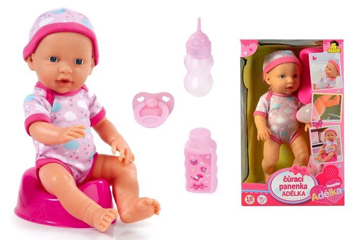Panenka s české kolekce Adélka. Napije se a čůrá. Součástí balení je nočník, dudlík a dvě lahvičky. Rozměr panenky: 30cm.
