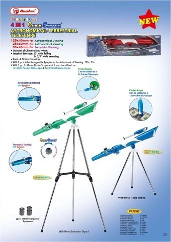 Průměr objektivních čoček: 40 mm Délka teleskopu: 23 ""přiskládání, 24 3/4 '' během prodloužení Rock a pinion zaostřování 2 ks.Vyměnitelné okuláry pro astronomické vidění 125×, 25× 1ks. 7×18mmFinder Scope, který lze využít jako 7×18 Poclet Telesop a 12× kapesnímikroskop