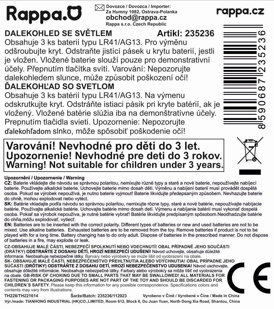 Dětský plastový dalekohled 12 x 15 cm se světlem. Bezva kousek pro malé pozorovatele. Obsahuje 3 ks baterií typu LR41/AG13. S tímto dalekohledem ti určitě nic neunikne!