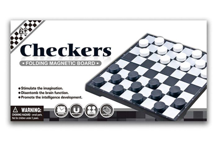 Dáma desková hra. Rozměry krabičky 20x3x10 cm. Figurky a hrací deska jsou magnetické.