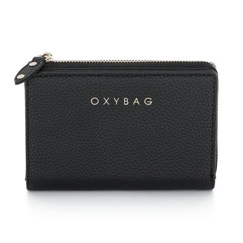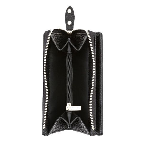 Menší dámská peněženka v černém provedení. Uvnitř je 10 menších kapes na věrnostní karty, 1 větší kapsa, 1 oddělená přihrádka na hotovost a oddělená uzavíratelná kapsa na zip na drobné mince.