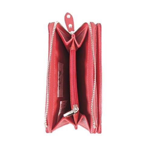 Menší dámská peněženka v korálovém provedení. Uvnitř je 10 menších kapes na věrnostní karty, 1 větší kapsa, 1 oddělená přihrádka na hotovost a oddělená uzavíratelná kapsa na zip na drobné mince.