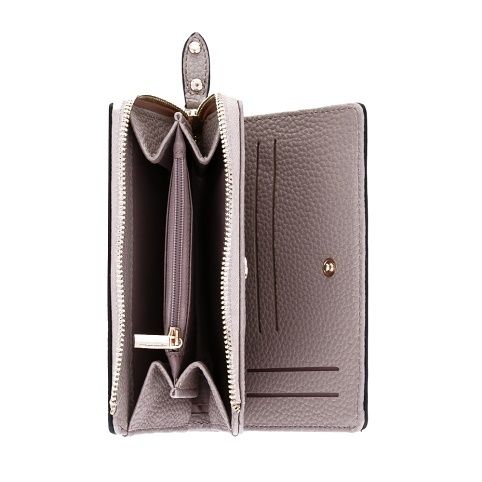 Menší dámská peněženka v mocca provedení. Uvnitř je 10 menších kapes na věrnostní karty, 1 větší kapsa, 1 oddělená přihrádka na hotovost a oddělená uzavíratelná kapsa na zip na drobné mince.