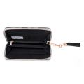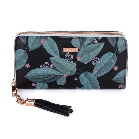 Velká dámská peněženka v tmavém provedení. Uvnitř je 8 menších kapes na věrnostní karty, 2 větší kapsy, 3 oddělené přihrádky na hotovost a 1 uzavíratelná kapsa na zip na drobné mince.