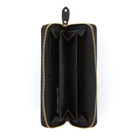 Velká dámská peněženka v černém provedení. Uvnitř je 8 menších kapes na věrnostní karty, 2 větší kapsy, 3 oddělené přihrádky na hotovost a 1 uzavíratelná kapsa na zip na drobné mince.