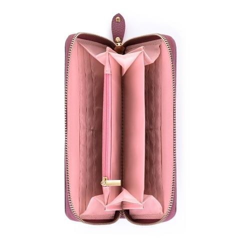 Velká dámská peněženka v růžovém provedení. Uvnitř je 8 menších kapes na věrnostní karty, 2 větší kapsy, 3 oddělené přihrádky na hotovost a 1 uzavíratelná kapsa na zip na drobné mince.