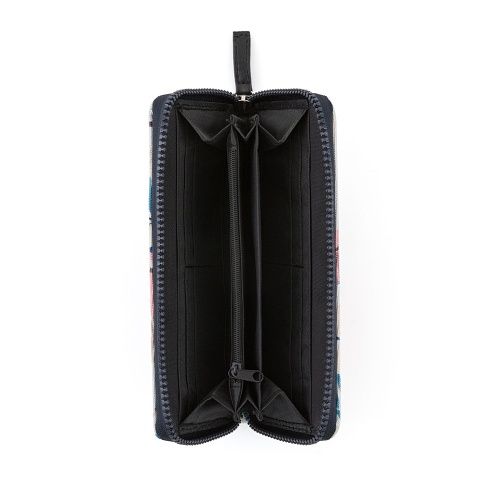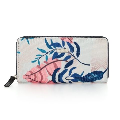 Velká dámská peněženka v barevném provedení. Uvnitř je 8 menších kapes na věrnostní karty, 2 větší kapsy, 3 oddělené přihrádky na hotovost a 1 uzavíratelná kapsa na zip na drobné mince.