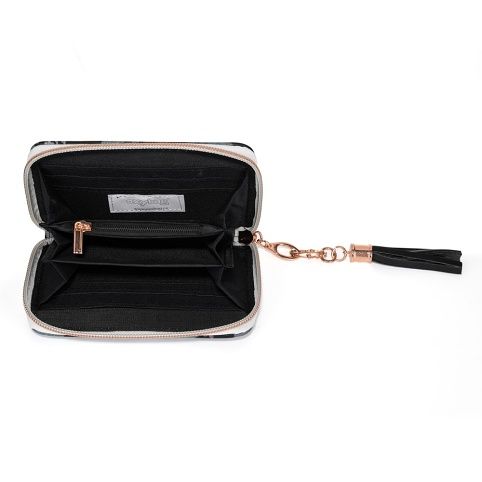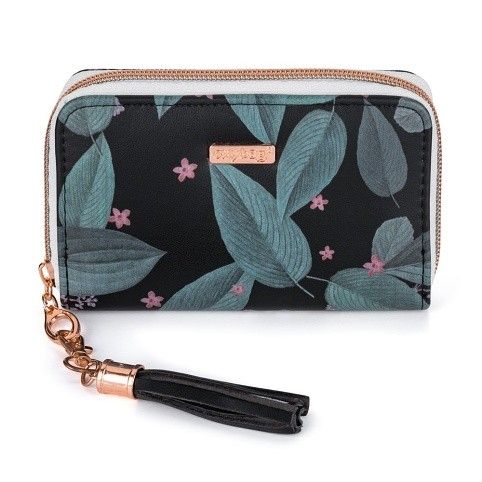 Malá dámská peněženka v tmavém provedení. Uvnitř jsou 4 menší kapsy na věrnostní karty, 3 oddělené přihrádky a 1 uzavíratelná kapsa na zip na drobné mince.