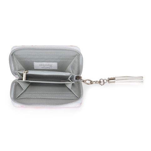Malá dámská peněženka v květinovém provedení. Uvnitř jsou 4 menší kapsy na věrnostní karty, 3 oddělené přihrádky a 1 uzavíratelná kapsa na zip na drobné mince.