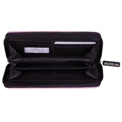 Velká dámská peněženka ve fialovém provedení. Uvnitř je 8 menších kapes na věrnostní karty, 2 větší kapsy, 3 oddělené přihrádky na hotovost a 1 uzavíratelná kapsa na zip na drobné mince.