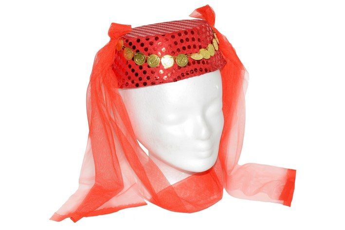 Krásný dámský klobouk se závojem, vhodný jako doplněk kostýmu břišní tanečnice.