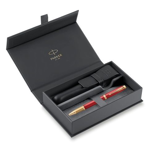 Dárková kazeta s rollerem Parker IM Premium Red GT sčerveně lakovaným mosazným tělem a víčkem s reliéfní rytinou vyvedenou pomocí laseru. Vkombinaci s doplňky pokovenými zlatem.