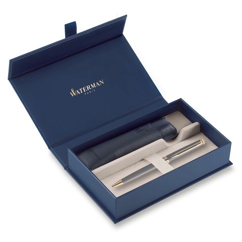 Dárková kazeta skuličkovým perem Waterman Hémisphere Stone Grey GT sšedě lakovaným nerezovým tělem. V kombinaci s doplňky pokovenými zlatem.