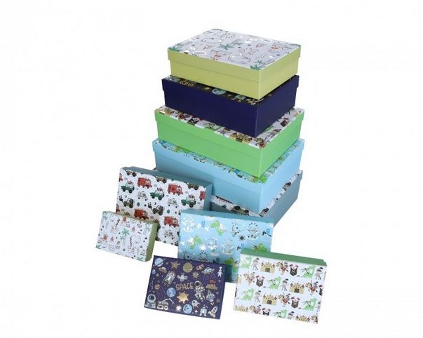 Veselá sada dětských dárkových krabiček v různých velikostech a motivech potěší každé dítě i dospělého, který rád balí dárky s fantazií. Krabičky jsou vyrobeny z pevného kartonu, mají odnímatelné víko a zdobí je hravé potisky s dětskými motivy – například zvířátka, dinosauři, hasiči, vesmír nebo piráti.