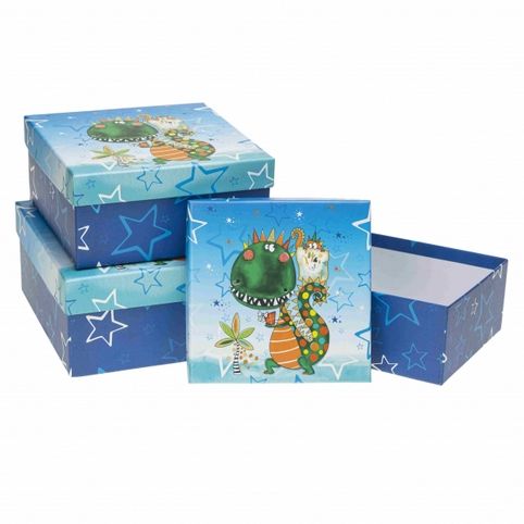 Veselá dětská sada tří dárkových krabiček s hravým motivem zeleného dinosaura a modrým pozadím s hvězdičkami. Ideální jako balení na narozeniny, svátek nebo oslavu narození dítěte. Vyrobeno z pevného kartonu s barevným potiskem, víko je plně odnímatelné. Krabičky jsou stohovatelné a vložené do sebe, takže nezabírají místo při skladování.Ideální volba pro dárkové balení menších předmětů, sladkostí nebo dekorace na dětskou oslavu.