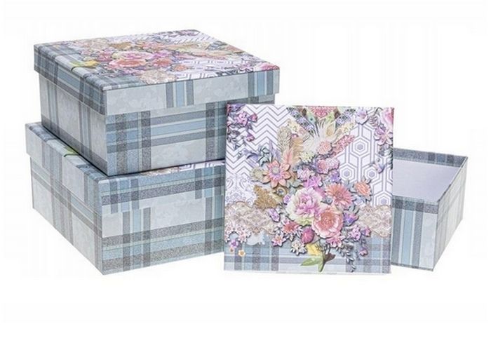 Stylová sada dárkových krabiček s jemným květinovým motivem v kombinaci s geometrickými vzory a modrým kostkovaným podkladem. Skvělé pro balení elegantních dárků, dekoraci interiéru nebo uskladnění drobností.