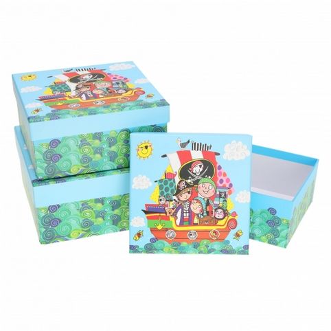 Veselá dětská sada tří dárkových krabiček s veselým pirátským motivem a modrým pozadím s hvězdičkami. Ideální jako balení na narozeniny, svátek nebo oslavu narození dítěte. Vyrobeno z pevného kartonu s barevným potiskem, víko je plně odnímatelné. Krabičky jsou stohovatelné a vložené do sebe, takže nezabírají místo při skladování.Ideální volba pro dárkové balení menších předmětů, sladkostí nebo dekorace na dětskou oslavu.