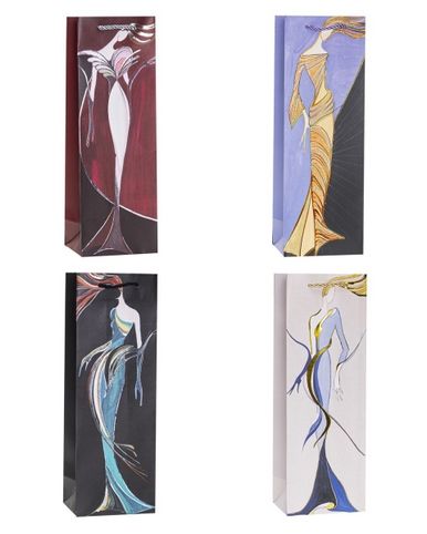 Luxusní dárková taška určená pro láhev vína nebo jiného alkoholu. Design s elegantní siluetou ženy v šatech dodá dárku styl a šmrnc. Ideální jako obal k narozeninám, oslavám nebo při slavnostním darování vína.deální pro zamilované, přátele nebo jako stylový obal na dárek k narozeninám, svátku či jen tak pro radost.Taška je vyrobena z kvalitního papíru, má lesklý povrch a pevné provázkové ucho.