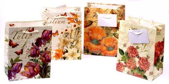 Luxusní dárková taška z 250g kartonu matný tisk s glitrem a textilními uchy. Balení po 12 ks. Mix 4 motivů.