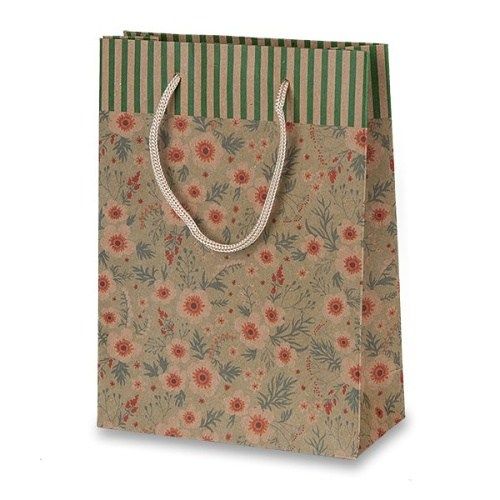 Dárková papírová taška v ataktivním motivu květin na hnědém kraftovém papíru. Rozměr: 145 x 192 x 55 mm.