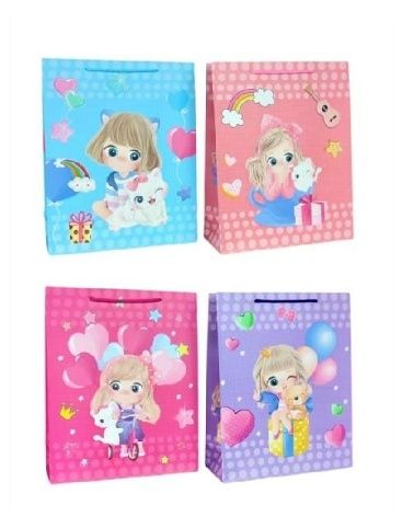 Dětská dárková taška s roztomilým motivem holčičky a zvířátka. Rozměry 24×18×9 cm. Barevné provedení, pevné uši, ideální na dárky pro děti.