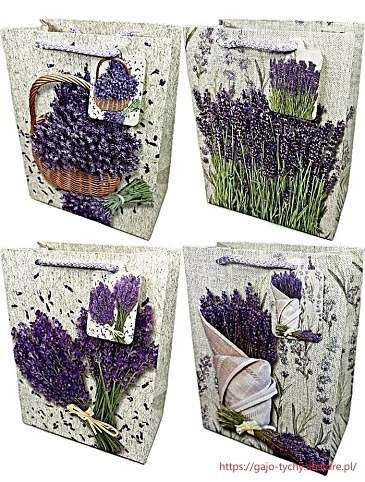 Dárková taška s motivem levandule. Rozměry 24 × 18 × 9 cm.