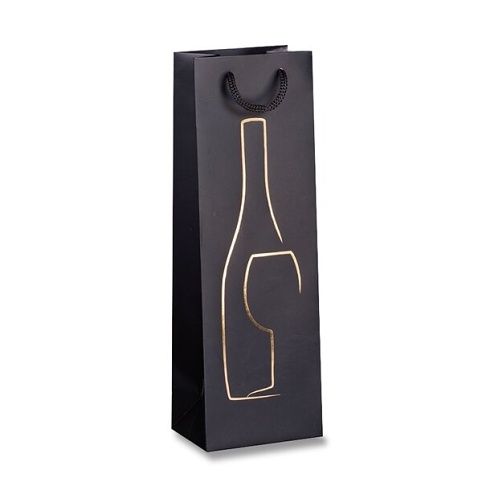 Dárková papírová taška na lahev zdobená zlatou termoražbou. V černém a červeném provedení má taška matný povrch, v béžovém provedení kraftový povrch.
