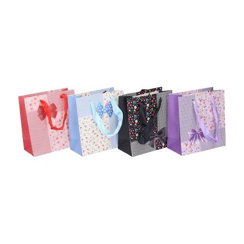 Dárková taška s kytičkami a mašličkou Barevné varianty - modrá, fialová, černá, růžová Rozměr: • Š 14cm • V 15cm • H 7cm