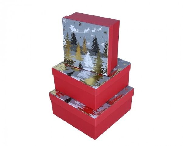 Elegantní dárková krabice. Krabice mají pevnou konstrukci, červené boky a víko s vánočním motivem.Ideálníální pro stylové balení dárků, dekoraci interiéru nebo jako úložné boxy během svátků.