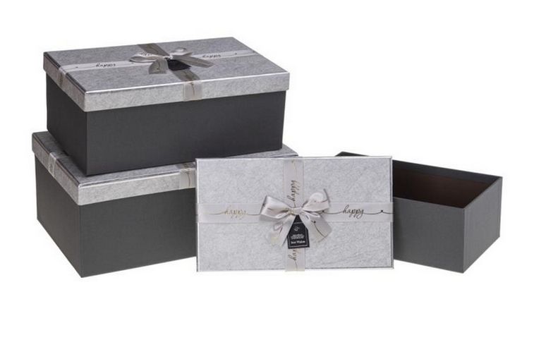 Elegantní sada dárkových krabic v decentní šedé barvě s lesklým víkem, stužkou a mašlí je ideální volbou pro stylové a slavnostní balení dárků. Díky kvalitnímu provedení poslouží i jako dekorativní úložný box pro domácnost.