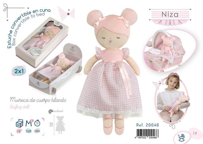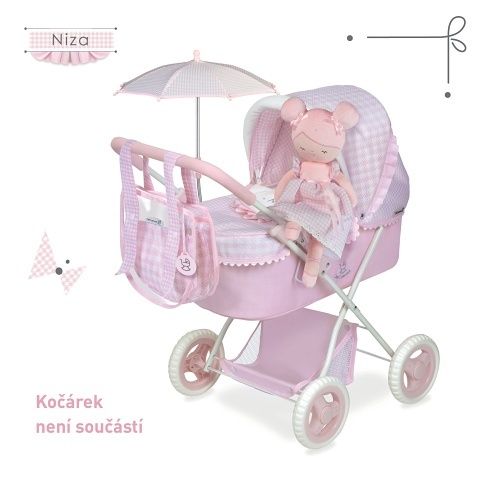 Plyšová panenka NIZA je malá baletka, patřící do stejnojmenné něžně růžové kolekce, která je novinkou roku 2022 a nabízí kromě různých druhů kočárků i nábytek pro panenky a malé parádnice. Charakteristická je pro ni jednobarevná růžová v kombinaci s růžovobílou drobnější kostičkou. Panenka je balena v ozdobné dárkové, důmyslně vyrobené krabičce 2v1 s průhledným víkem, ze které jde velmi snadno udělat pohodlnou kolébku. Panenka je vyrobena z vysoce kvalitního hladkého lesklého plyše a je pratelná (ručně na 30 °C). Díky své velikosti a lehoučké váze je ideální společnicí každé malé holčičky nejenom na cestách, ale díky měkkému materiálu je příjemná i na mazlení do postýlky. Velikost 36 cm. Doporučený věk 12m +.