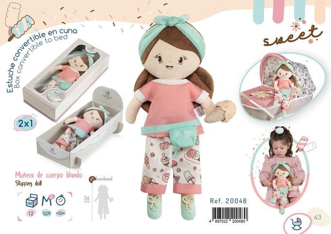 Charakteristická je pro ní sladěná kombinace barev lososové s béžovou a bílé s jemnými motivy drobných dortíků, zmrzlinek a muffinů, které působí roztomile a hravě. Panenka je balena v ozdobné dárkové, důmyslně vyrobené krabičce 2v1 s průhledným víkem, ze které jde velmi snadno udělat pohodlnou kolébku. Panenka je vyrobena z vysoce kvalitního hladkého lesklého plyše a je pratelná (ručně na 30 °C). Díky své velikosti a lehoučké váze je ideální společnicí každé malé holčičky nejenom na cestách, ale díky měkkému materiálu je příjemná i na mazlení do postýlky. Velikost 36 cm. Doporučený věk 12m +.