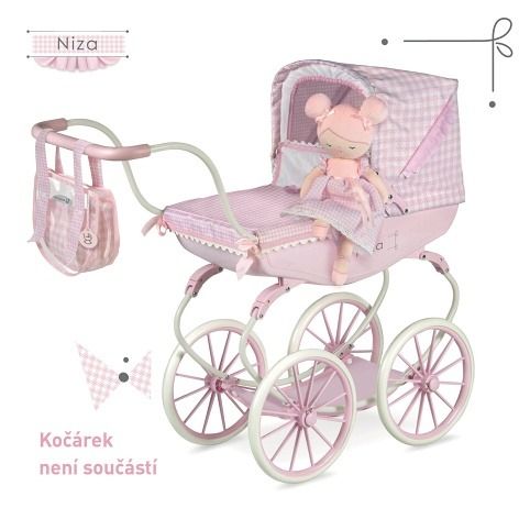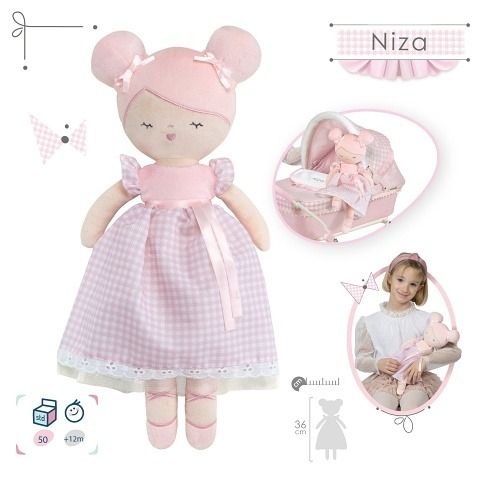 Plyšová panenka NIZA je malá baletka, patřící do stejnojmenné něžně růžové kolekce, která je novinkou roku 2022 a nabízí kromě různých druhů kočárků i nábytek pro panenky a malé parádnice. Charakteristická je pro ni jednobarevná růžová v kombinaci s růžovobílou drobnější kostičkou. Panenka je vyrobena z vysoce kvalitního hladkého lesklého plyše a je pratelná (ručně na 30 °C). Díky své velikosti a lehoučké váze je ideální společnicí každé malé holčičky nejenom na cestách, ale díky měkkému materiálu je příjemná i na mazlení do postýlky. Panenka je balena v igelitovém obalu. Velikost 36 cm. Doporučený věk 12m +.