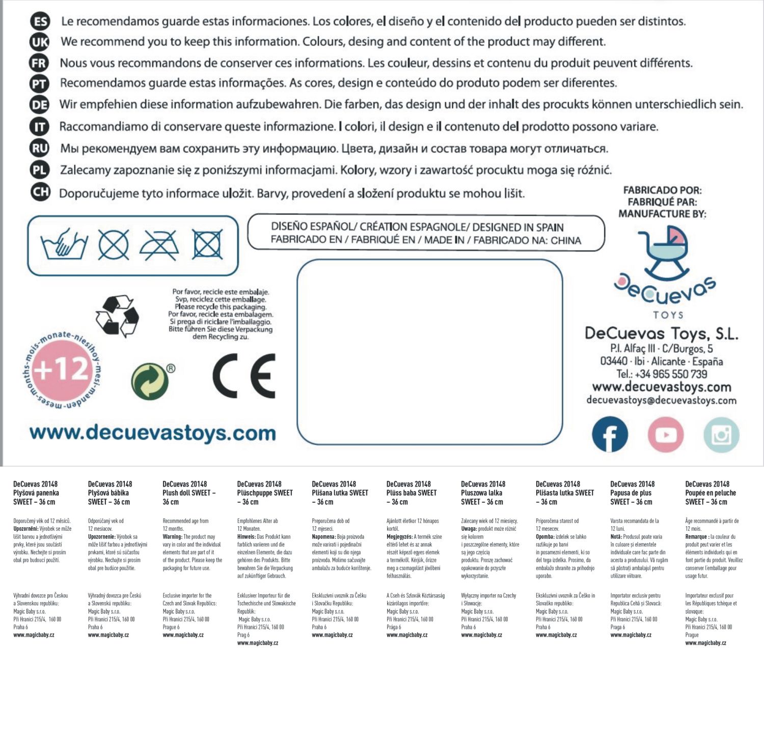 DeCuevas 20148 Plyšová panenka SWEET - 36 cmPlyšová panenka SWEET je malá slečna se zmrzlinkou v ruce, patřící do stejnojmenné kolekce, která je novinkou roku 2022 a nabízí kromě různých druhů kočárků i další doplňky pro budoucí hospodyňky. Charakteristická je pro ní sladěná kombinace barev lososové s béžovou a bílé s jemnými motivy drobných dortíků, zmrzlinek a muffinů, které působí roztomile a hravě. Panenka je vyrobena z vysoce kvalitního hladkého lesklého plyše a je pratelná (ručně na 30 °C). Díky své velikosti a lehoučké váze je ideální společnicí každé malé holčičky nejenom na cestách, ale díky měkkému materiálu je příjemná i na mazlení do postýlky. Panenka je balena v igelitovém obalu. Velikost 36 cm. Doporučený věk 12m +.Doplňující informace:• Nádherný španělský design• Materiál: plyš, polyester, duté vlákno• Pratelná ručně na 30 °C• Rozměry samotné panenky: 15 x 8 x 36 cm (š x d x v)• Baleno v ochranném igelitovém obalu • Rozměry balení 15 x 8 x 36 cm (š x d x v)• Váha balení: 0,12 kg• Doporučený věk od 12 měsíců