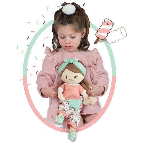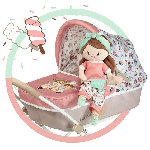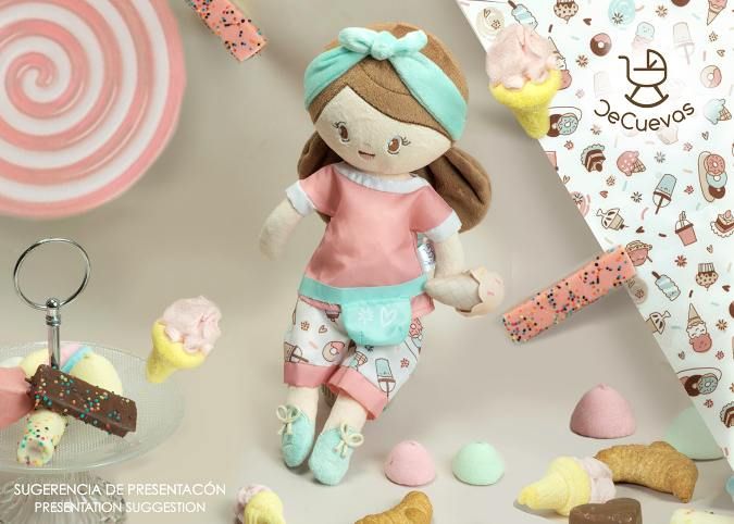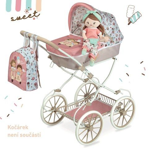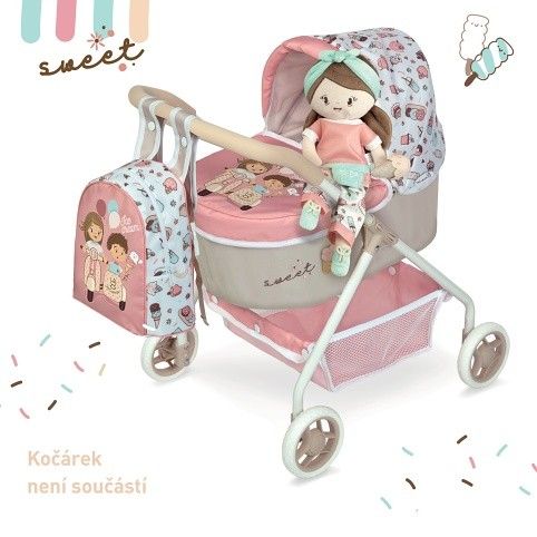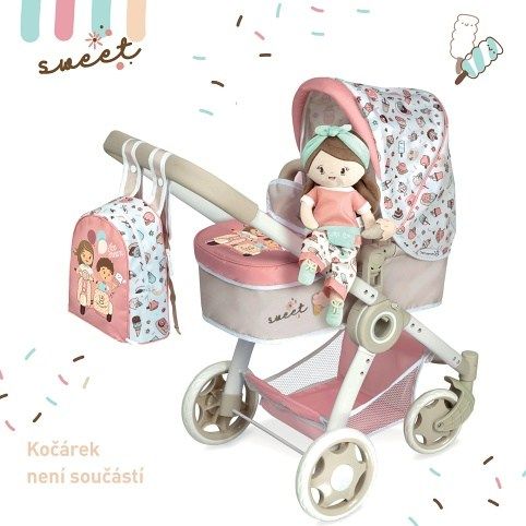 Plyšová panenka SWEET je malá slečna se zmrzlinkou v ruce, patřící do stejnojmenné kolekce, která je novinkou roku 2022 a nabízí kromě různých druhů kočárků i další doplňky pro budoucí hospodyňky. Charakteristická je pro ní sladěná kombinace barev lososové s béžovou a bílé s jemnými motivy drobných dortíků, zmrzlinek a muffinů, které působí roztomile a hravě. Panenka je vyrobena z vysoce kvalitního hladkého lesklého plyše a je pratelná (ručně na 30 °C). Díky své velikosti a lehoučké váze je ideální společnicí každé malé holčičky nejenom na cestách, ale díky měkkému materiálu je příjemná i na mazlení do postýlky. Panenka je balena v igelitovém obalu. Velikost 36 cm. Doporučený věk 12m +.