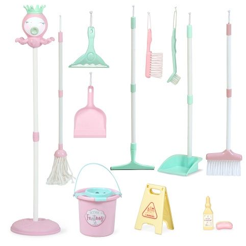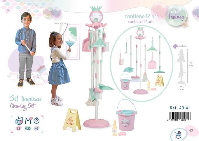 DeCuevas 40141 Úklidový set Ocean Fantasy 2022 - 13 dílů, z překrásné světle růžové kolekce s malou mořskou vílou, je zcela novým výrobkem této španělské značky. Díky mnoha praktickým úklidovým prvkům, jako je mop se ždímacím kbelíkem, lopatka se smetáčkem nebo stěrka na okno nebo podlahu a další, si malé hospodyňky mohou vyzkoušet většinu běžných domácích úklidových prací, které pak třeba mohou vykonávat společně se svými rodiči. Tento úklidový set přináší dětem nejenom plno zábavy, ale je také pomocníkem při rozvoji senzomotorických dovedností.