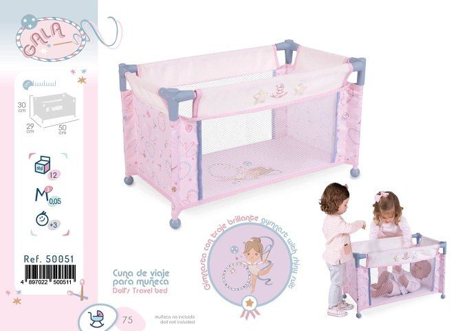 DeCuevas 50051 Cestovní postýlka pro panenky GALA 2023 patří do stejnojmenné růžovobílé kolekce s malou gymnastkou, zachycenou v baletně sportovní kreaci, která je novinkou roku 2023. Celou růžovobílou kolekci s drobným potiskem sportovních prvků doplňuje modrá barva a danou tematiku navíc podtrhují sportovně laděné tašky na kočárkách. Kolekce nabízí nejen zmíněné kočárky, ale i jiné doplňky pro malé slečny a jejich panenky.
